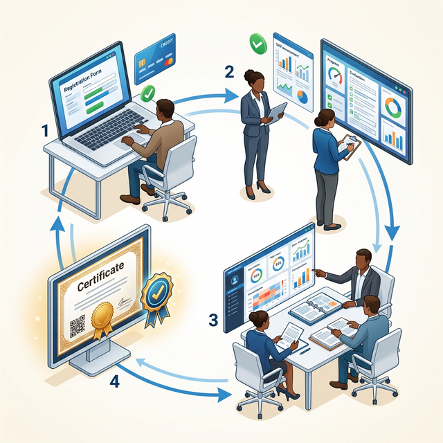Four steps from registration to your AI Readiness Certificate - with a 30-day assessment window.